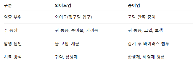 둘 다 귀 통증을 동반하지만, 고열이 있는 경우에는 중이염일 가능성이 높으므로 반드시 병원 진료가 필요합니다.