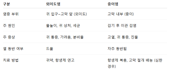 외이도염과 다르게 **전신 증상(열, 식욕 저하 등)**이 동반되는 경우가 많습니다.
