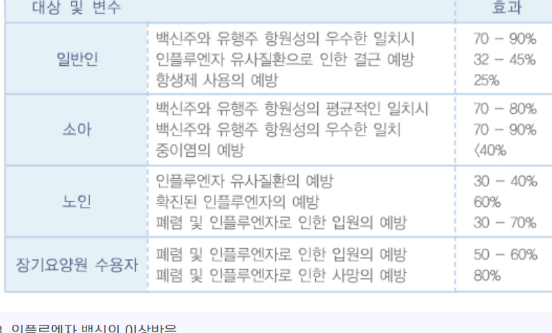 또한 접종한 백신의 바이러스와 당해 유행 바이러스의 종류가 다르면 백신의 효과가 떨어지며 백신을 접종받는 사람의 연령, 기저질환, 건강상태에 따라서도 백신의 효과가 다를 수 있습니다.
