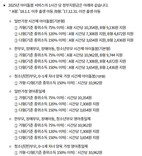 아이돌돔 아이돌보미 서비스는 아이의 연령에 따라, 가정의 중위소득에 따라 정부지원금이 차등지급됩니다.